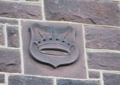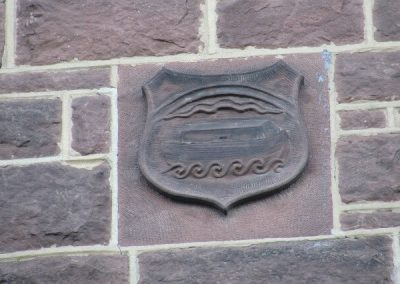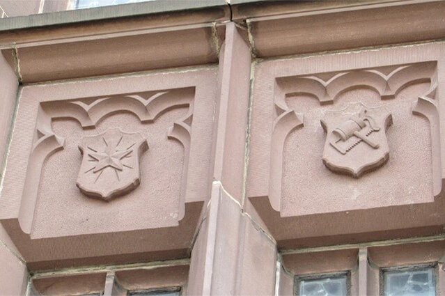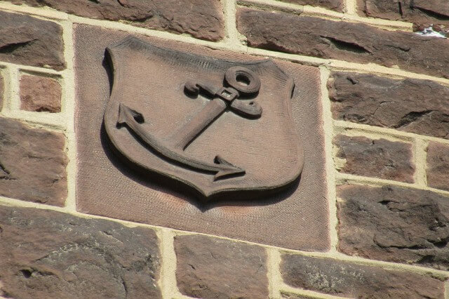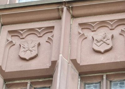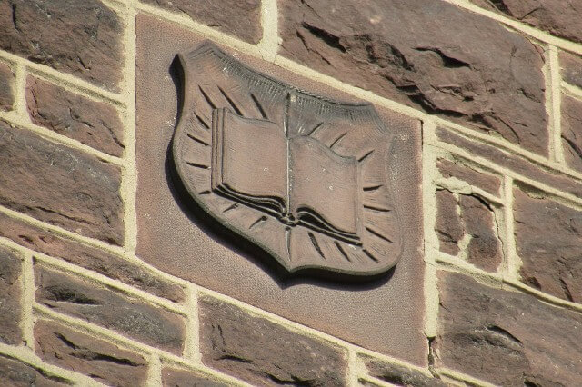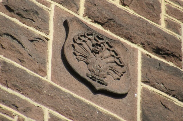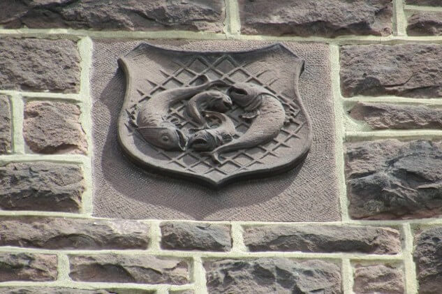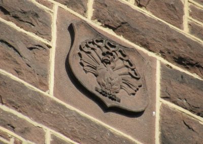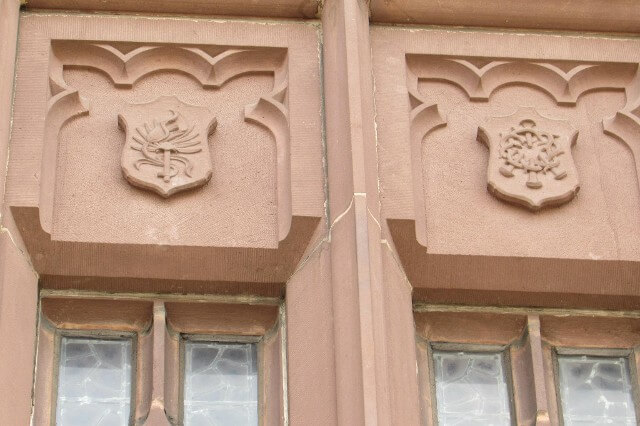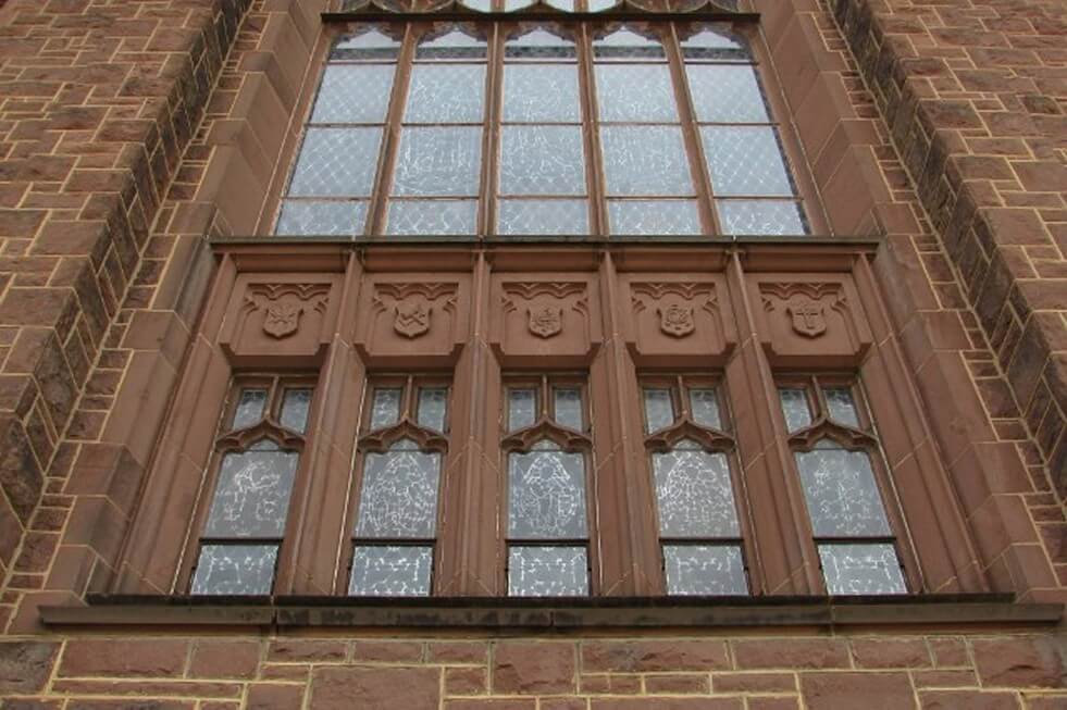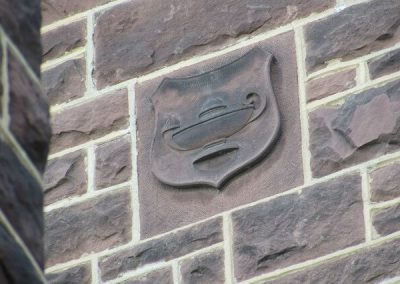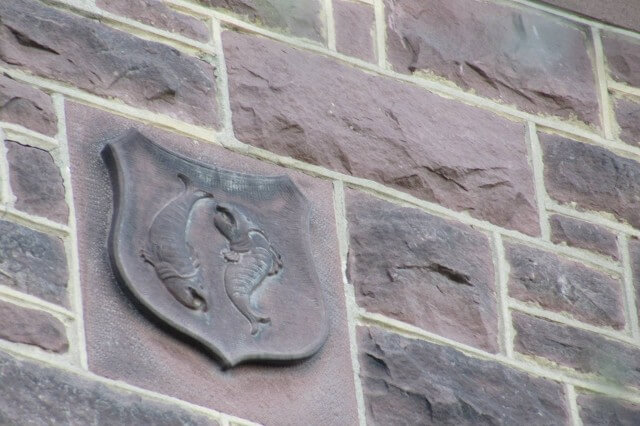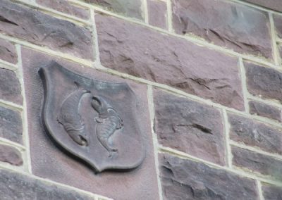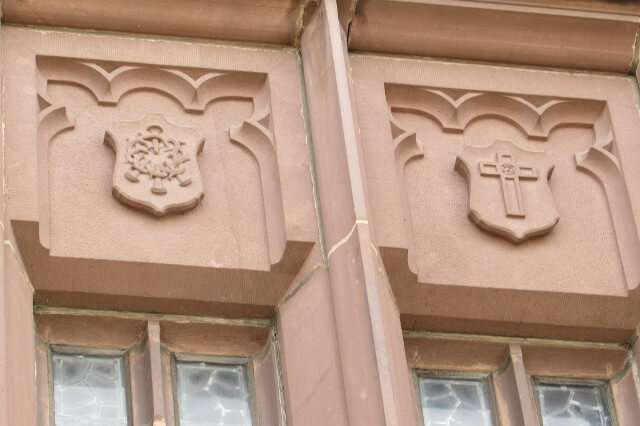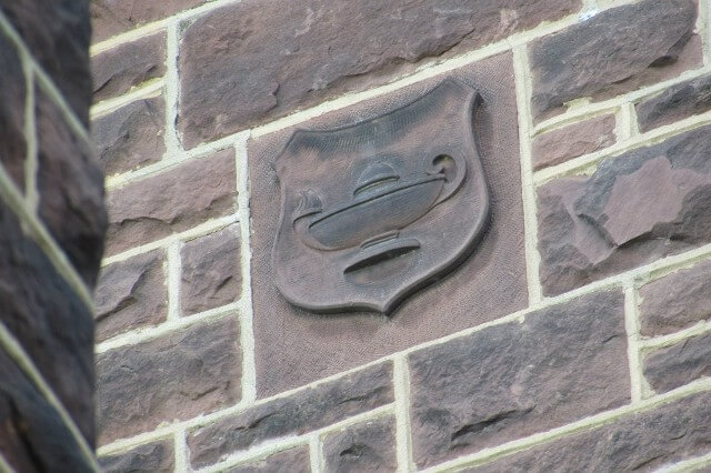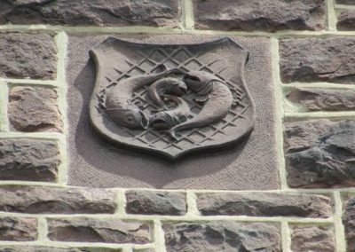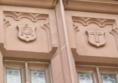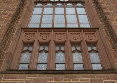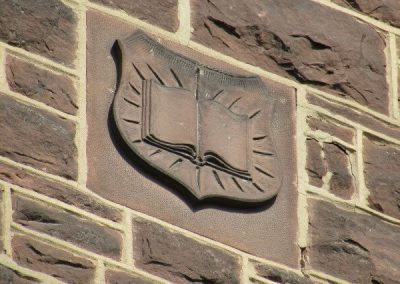 On the exterior walls of the building, high up near the roof, are to be seen various symbolic designs. On the west side, beginning at Main Street, they are as follows: Four fishes caught in a net, signifying God’s care over those who trust Him; the Anchor which is our faith in His Word; the Bible, and finally the Peacock, which is the symbol of immortality. On the east side, beginning at Main Street, they are as follows: Two fish, for as the draught of fishes on the west side shows his miraculous power able to supply all our needs, these show his daily provision; the Crown; the Ark which from the days of the Roman Catacombs has pictured the Church as able to ride through all periods of persecution, and the Lamp which is the light of His Word. In the panels between the two portions of the front window on Main Street are found cut in the stone: the Star of Bethlehem, the Carpenter’s tools (for Christ was a carpenter), the Lilly and the Palm (symbols of purity and triumph), the Crown of Thorns, and the Cross.